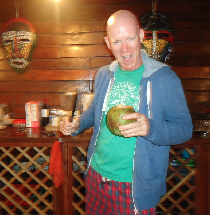 Trip’s going super well. Exhibit A: my girlfriend’s making exotic cocktails for my cheering family. To help her out, I just sawed open a coconut to add the sweet water inside.