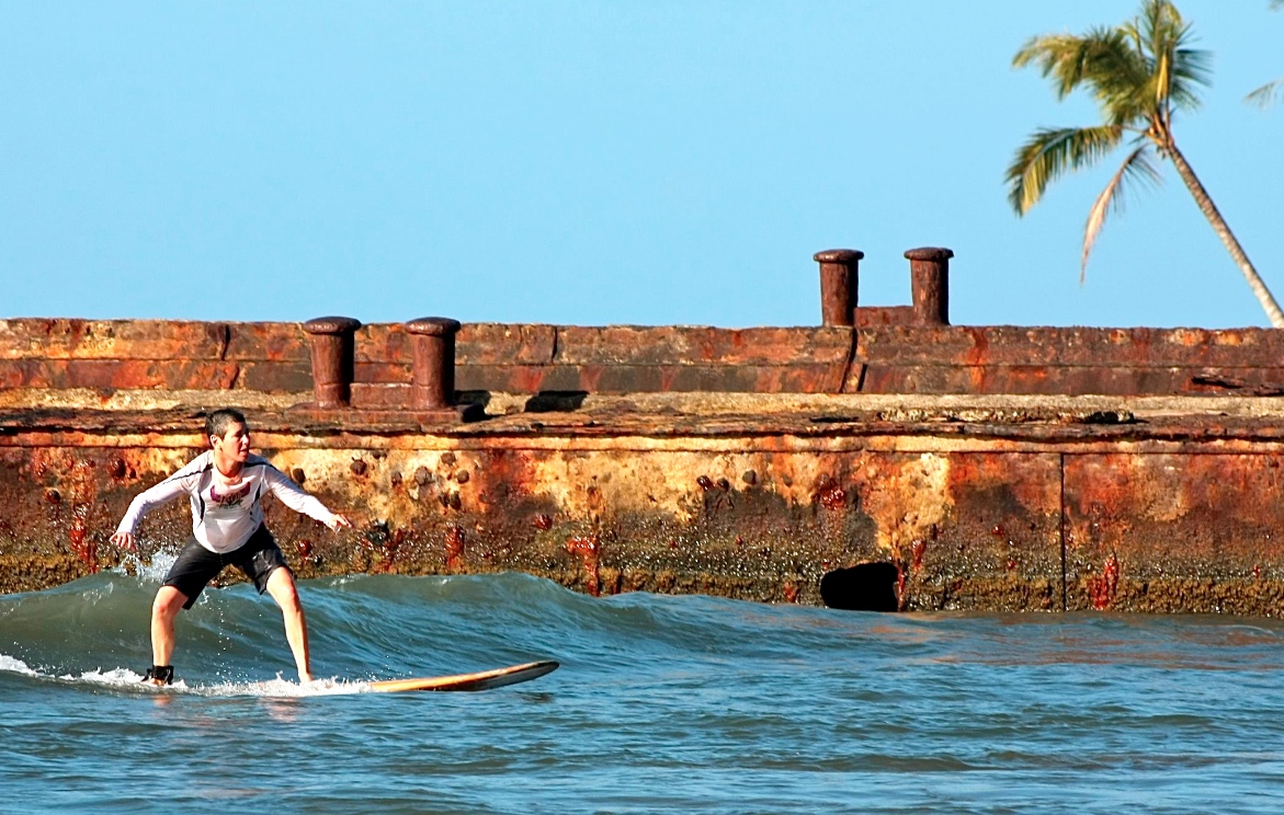 Best surfer in the family: (tie) my brother and his girlfriend, Maureen. Here she’s surfing past a rusty abandoned barge that exists purely to sprout palm trees and look wicked in pictures.