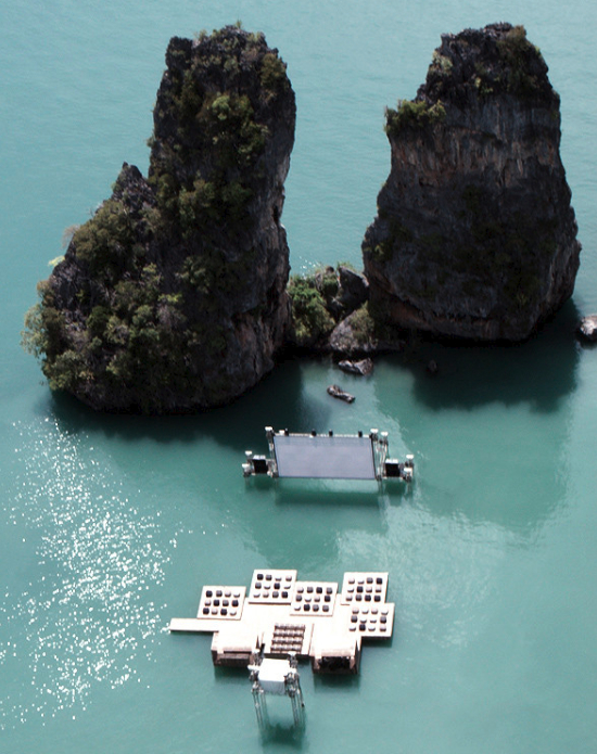 The theatre was built on a large raft build out of recycled materials that fit together to make a floating platform. The theatre’s German-born, Beijing-based architect, Ole Scheeren, calls it his Archipelago Cinema. According to this design magazine, Scheeren took his inspiration from the floating lobster farms in Thailand. He then designed the floating theatre as a cluster of modular chunks, built to look like islands which have floated together to form a solid mass.
