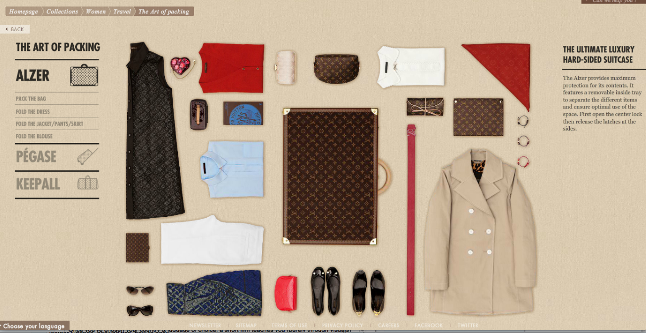 The French fashion house has made the site interactive. Click different buttons on the screen, and you can select different tips on packing either their classic Alzer suitcases, rolling suitcases (Pégase), or their keepall totes.