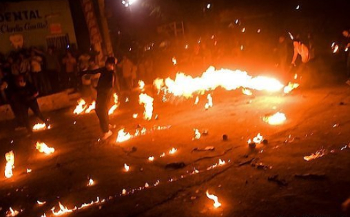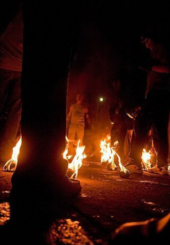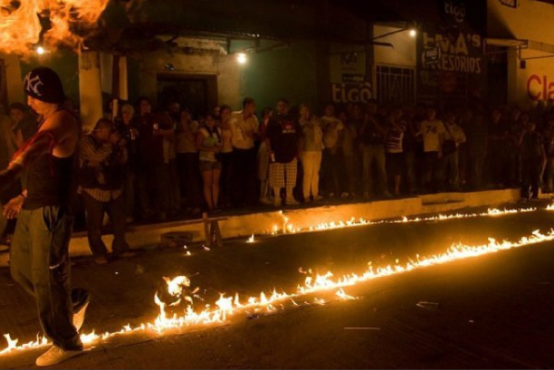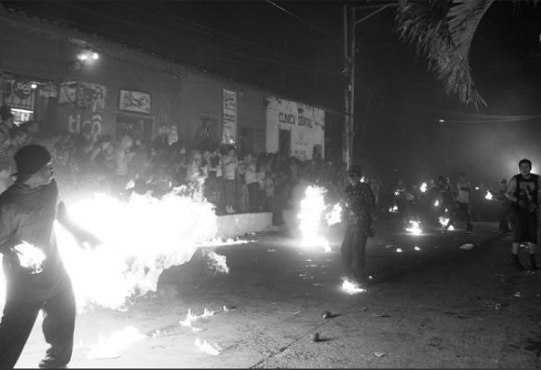 Each August, the good youths of Nejapa, El Salvador (14 kilometers north of El Salvador’s capital, San Salvador) tie rags up with wire, and soak them in kerosene. Then on the evening of August 31st, the teenagers paint their faces with fierce & scary patterns, take to the streets, light up the rags, and huck balls of fire at each other. What could possibly go wrong?