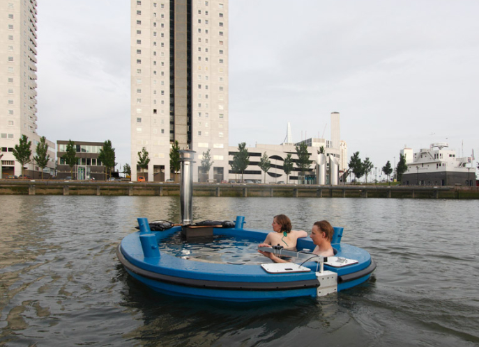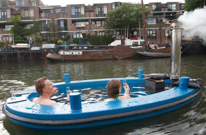 This ingenious ‘jacuzzi boat’ is made of wood and fitted with glass fiber reinforced polyester. It holds 2000 liters of water and the wood stove takes 2.5 hours to heat your HotTug to a spine-tingling 38 degrees Celsius. Then simply untie your moor line, pop into your tub, ease off the dock, and float down river in your hot human soup bowl.