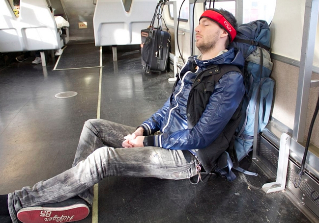 It costs a mere $39 U.S. and comes in its very own carrying case. To order your headband today, visit the product’s Indiegogo page. Their crowd-funding goal is $45,000 and if they reach it, they aim to deliver your headband in a month’s time. Then you can fall asleep anywhere, even on the ground like this scruffy backpacker: