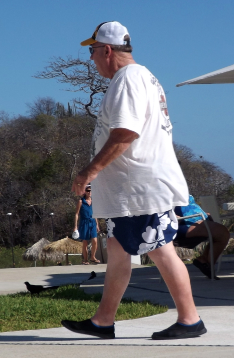 Next on the runway is this intriguing mash-up of Costco glam and Harley Davidson couture. From his ball cap down to his water socks, there isn’t much to complain about this timeless resort look.