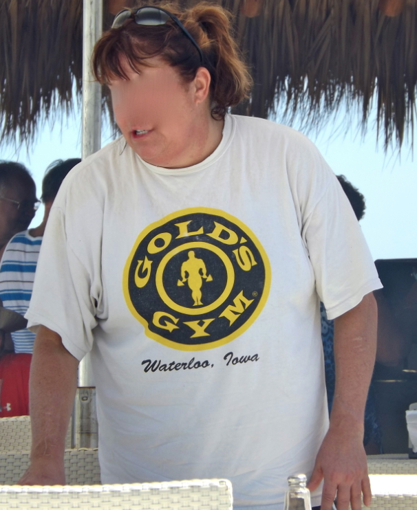 The Gold’s Gym shirt is fashionably big and baggy. Male fashionistas wear it to appear strong and mighty like ‘70s-era Arnold Schwarzenegger, while resort women wear it as a slimming agent to conceal excess piña colada poundage. The GG shirt (XXL is the preferred size) protects your back from sunburn when you’re pounding back rainbow shots at the swim-up bar. And the wet clingy cotton cools your skin down when worn as semi-formal evening wear.
