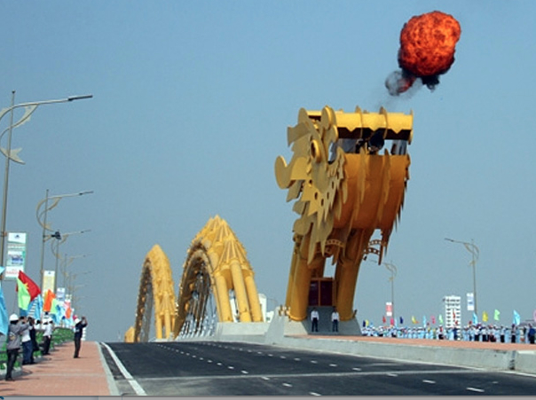 To celebrate the 38th anniversary of its liberation at the end of the Vietnam War (a.k.a. its capture by North Vietnamese communists), the city of Da Nang, Vietnam has unveiled Dragon Bridge which features a humongous dragon breathing great balls of fire.