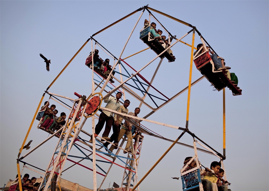 Just young male wallahs (let’s call them carnies) who take turns climbing up the rickety old ferris wheel. Then they leap and grab onto a bar, using their weight to whip the ferris wheel around and deposit them back on Earth. Repeat, over and over again, until night falls or they do.