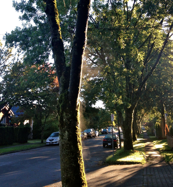 Rain-soaked trees steaming in the morning sunlight